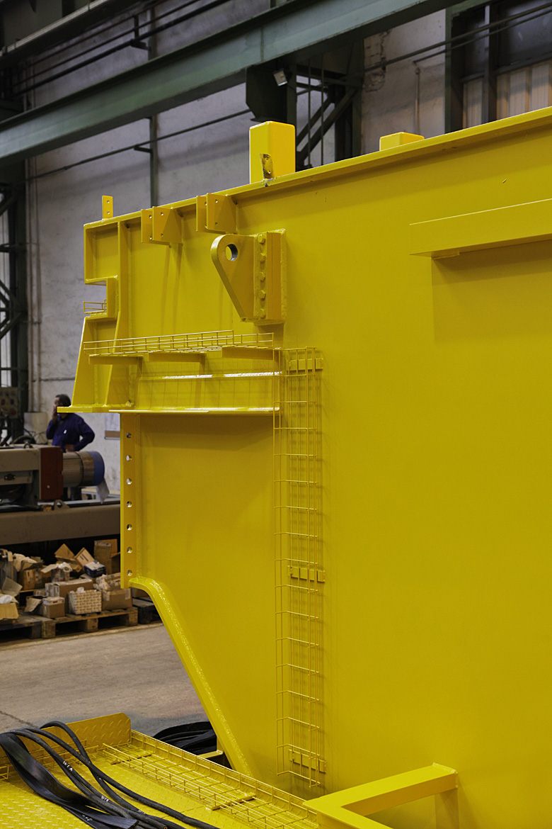Double girder open winch with 80/40t capacity, gearbox GHG-4T on the main elevation with M5 working group and fixed hoist GHF with M4 working group in secondary. The span of the crane is 27.78 m and height 15.2 m elevation. and 13.6 m.